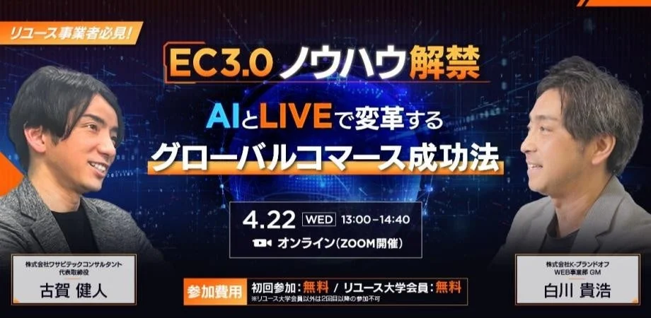 いま求められているのは、「AI × LIVE × グローバル」で戦う「EC3.0」という新しい戦い方。本セミナーでは、リユース事業者に特化し、実際に売上を伸ばしてきたリアルなデータや事例をもとに、グローバルで勝つための具体的な戦略が「現場レベル」で解説されます。初回参加者やリユース大学会員は無料で参加できるとのことなので、このチャンスを逃す手はありません!