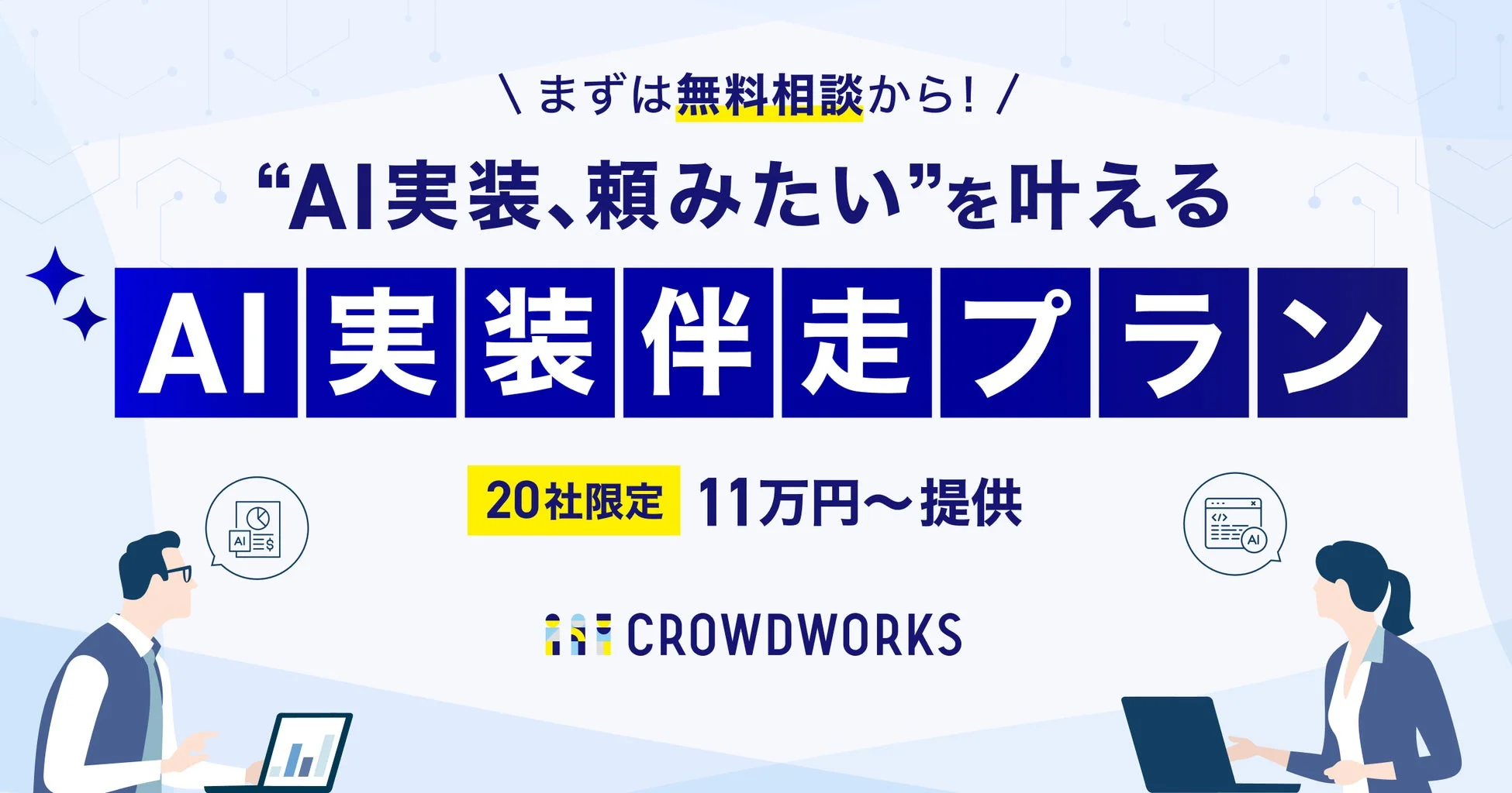 クラウドワークスが2026年3月18日より提供を開始した「AI実装伴走プラン」は、各企業の状況に合わせたAI開発を一気通貫でサポートするサービスです。20社限定で、特別価格11万円(税込)から提供されます(業務の複雑性や実装範囲により別途見積もりが必要な場合もあります)。