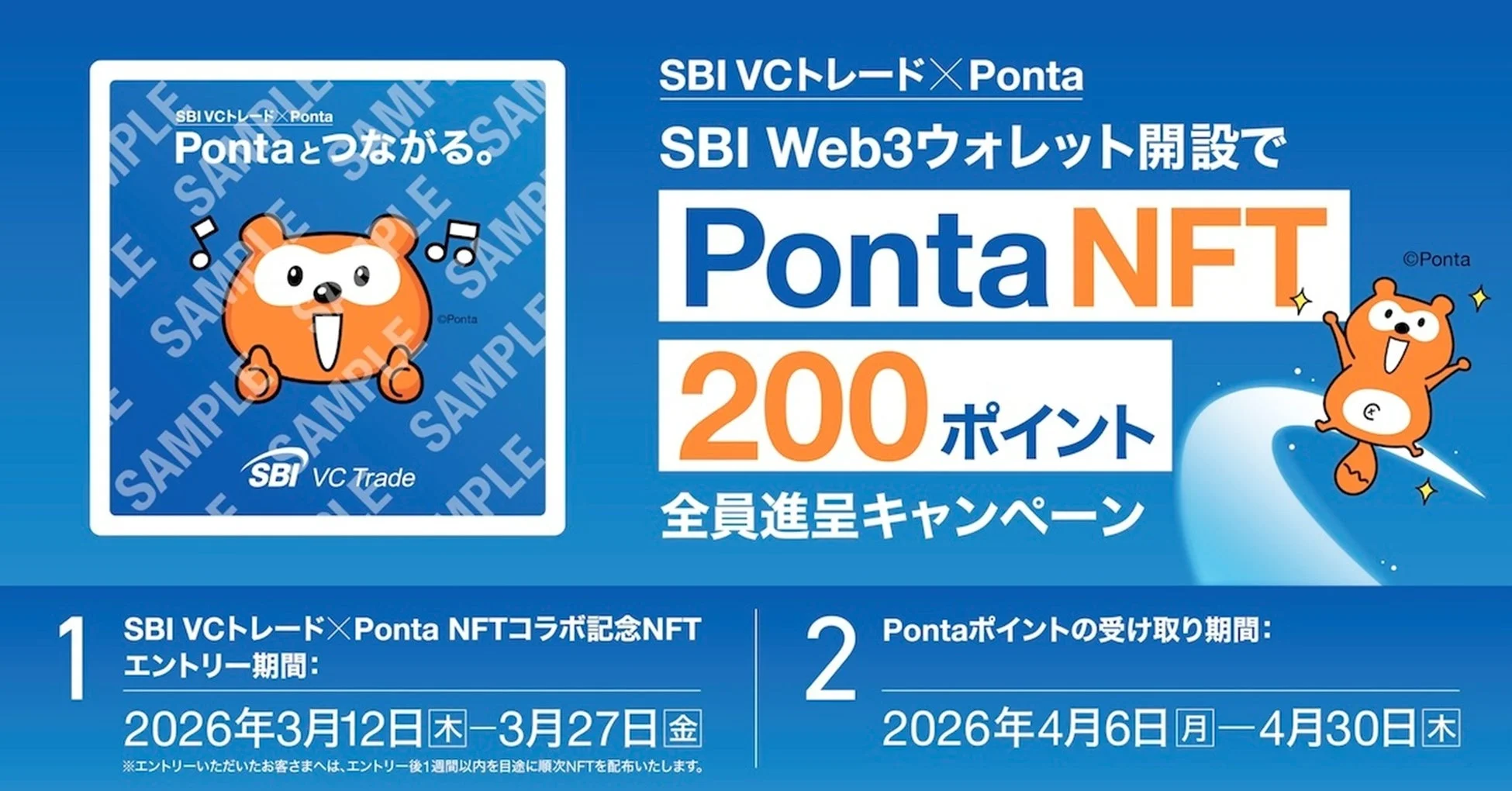 ここでしか手に入らない、SBI VCトレードとPontaのコラボレーションを記念した特別なNFT(非代替性トークン)がプレゼントされます。デジタルアートやコレクションに興味がある方にはたまらない一品ですね。ただし、今回配布されるNFTは「SBI Web3ウォレット」からの出庫や二次利用はできませんので、ご注意ください。