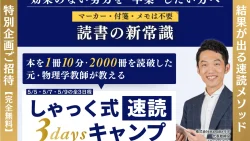 副業で成果を出したい皆さん、朗報です!累計4.4万人が体験した「しゃっく式速読 3daysキャンプ」がゴールデンウィークに無料開催されます。AI時代に求められる「成果に直結する読書法」を3日間でマスターし、あなたの知識を収益へと繋げるスキルを手に入れましょう!