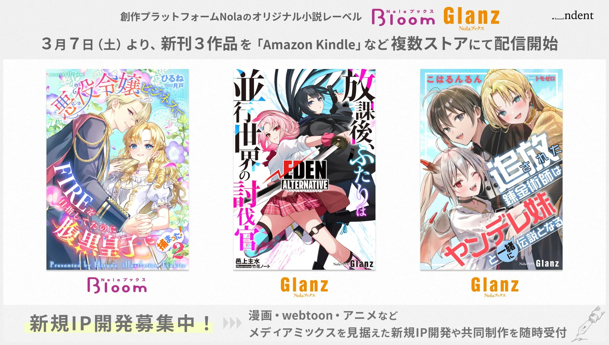 創作プラットフォーム「Nola」を運営する株式会社indentから、オリジナル小説レーベル「NolaブックスGlanz」(少年・青年ジャンル)と「NolaブックスBloom」(少女・女性ジャンル)より、待望の新刊3作品が2026年3月7日(土)より電子書籍ストア「Amazon Kindle」など複数ストアにて配信開始されました!