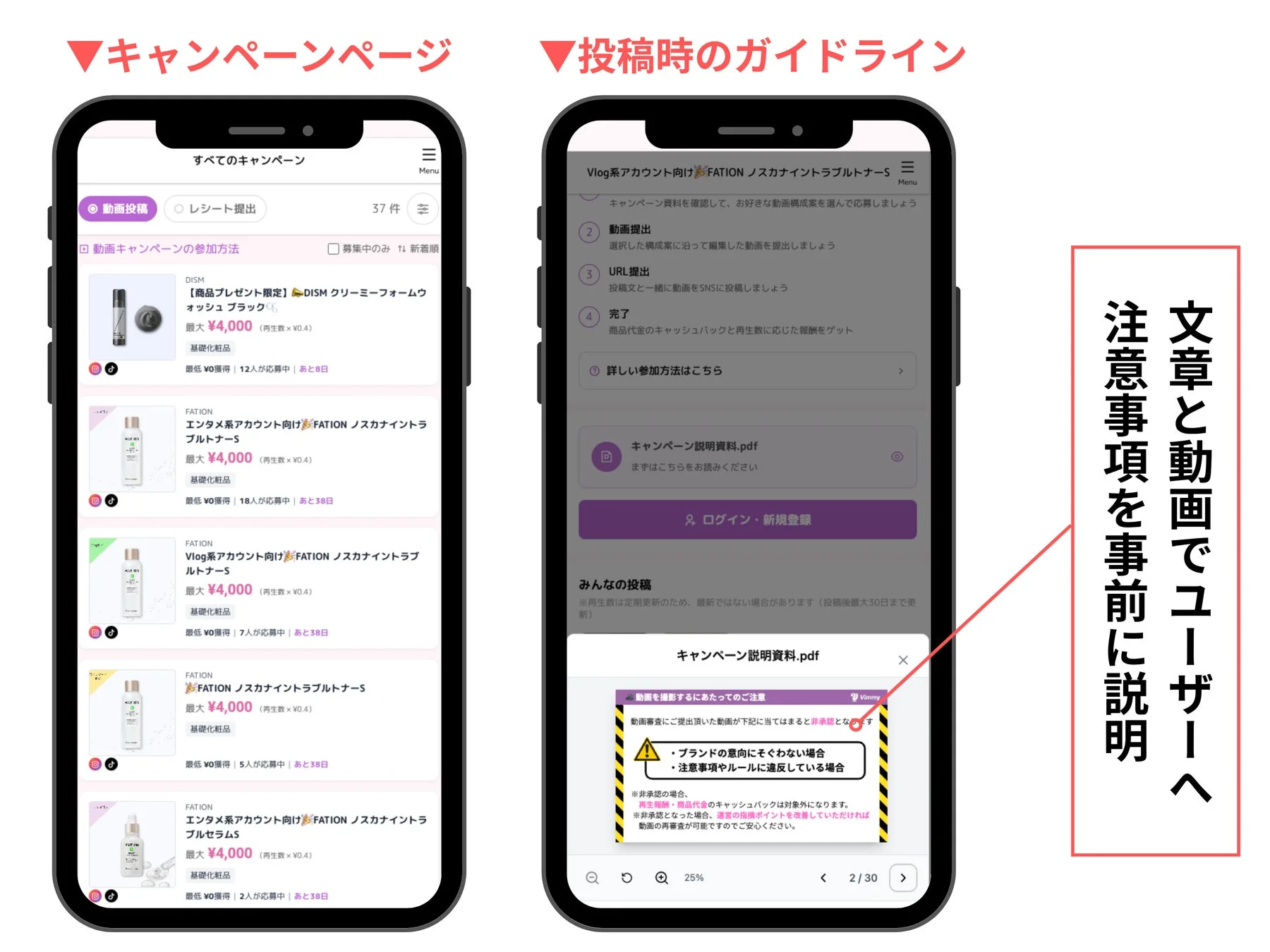 大量の動画投稿となると、品質のばらつきが心配になるかもしれません。しかしVimmyでは、キャンペーン説明資料による事前学習、好ましい動画例やNGとなる撮影方法を動画と文章で共有するなど、徹底したガイドラインを設けています。これにより、一定の品質を保ちながらUGC投稿を実現し、安心して「推し活」に集中できる環境が整っています。