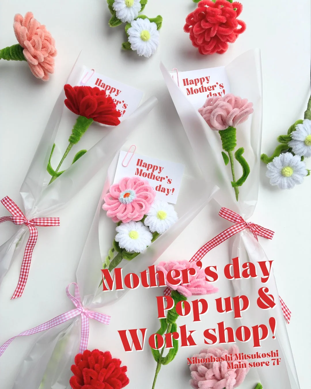 こうした反響を受け、今回は母の日に特化したカーネーション作りと、小さなお子様も楽しめるオリジナルブーケ作りが企画されました。会場では、職人たちが一つ一つ丁寧に作ったhanamaru flowerのモールフラワーを購入できるPOPUP STOREも同時開催されます。手作り体験だけでなく、プロの作品をお迎えするチャンスもありますよ。