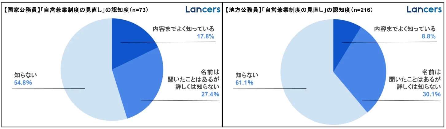 今回の調査で、国家公務員における「自営兼業制度の見直し」の認知度は、「内容までよく知っている」が2割未満にとどまり、「知らない」と回答した人が過半数を占める結果となりました。地方公務員ではさらに認知度が低い状況です。