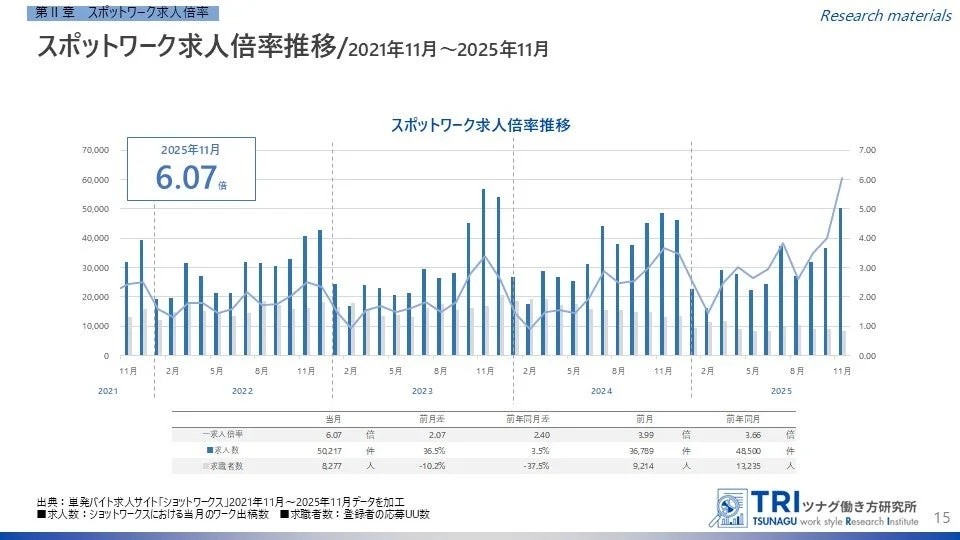 2025年11月度のスポットワーク求人倍率は、なんと6.07倍に達しました!前月から2.07ポイント、前年同月からは2.40ポイントも上昇しており、18か月連続で前年同月を上回っています。これは、年末に向けてスポットワークの需要が急増している証拠。特に倉庫内・軽作業の求人数が増加したことが大きく影響しているようです。
