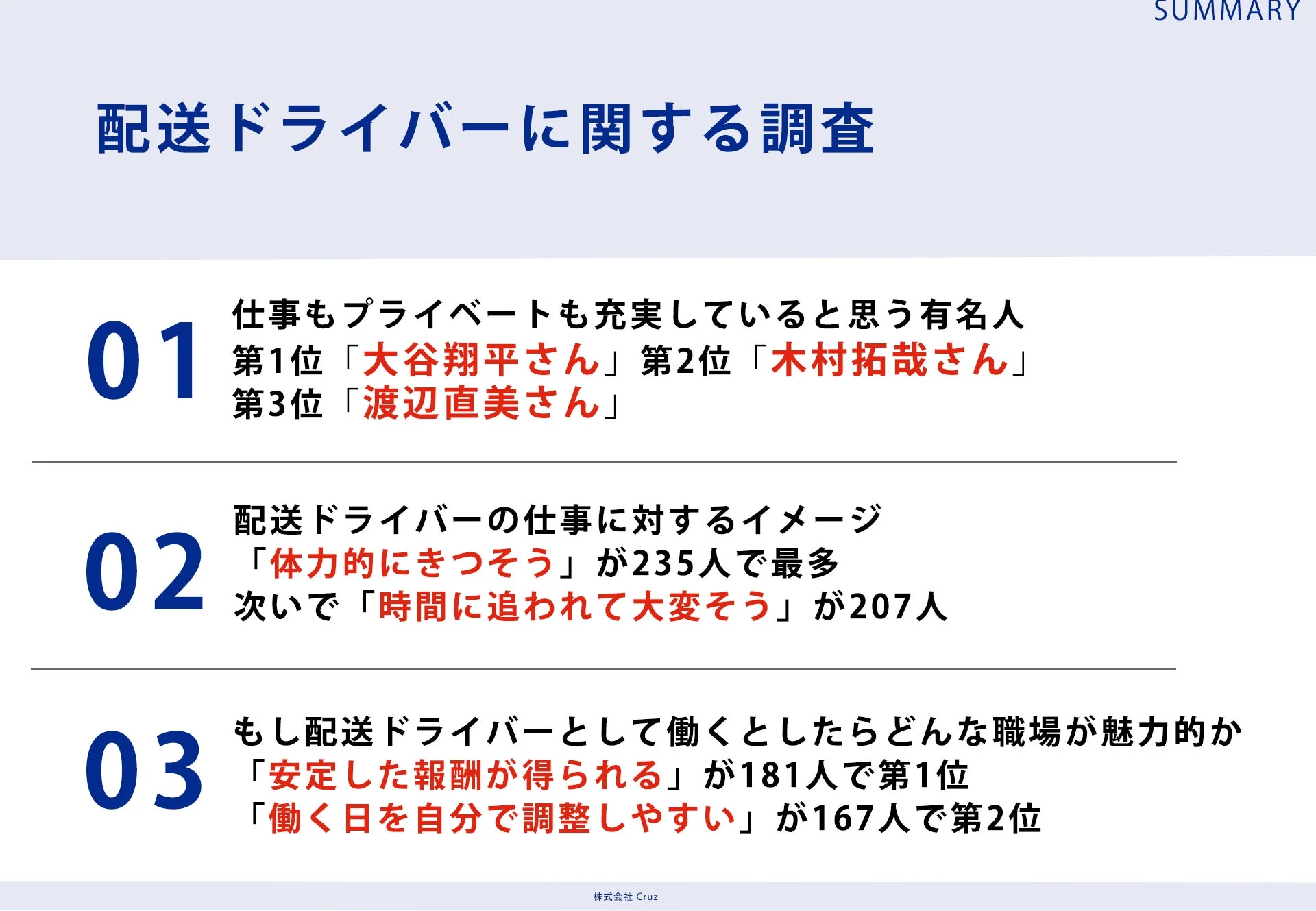 今回の調査結果から、仕事の成功とプライベートの充実を両立させるヒントが見えてきました。副業を始める際にも、憧れの有名人のように「オンオフ」を大切にし、自分に合った働き方を見つけることが成功への鍵となるでしょう。特に配送ドライバーのような需要の高い仕事で、柔軟な働き方や安定した報酬が期待できる職場は、副業ファンにとって大きな魅力となりそうです。