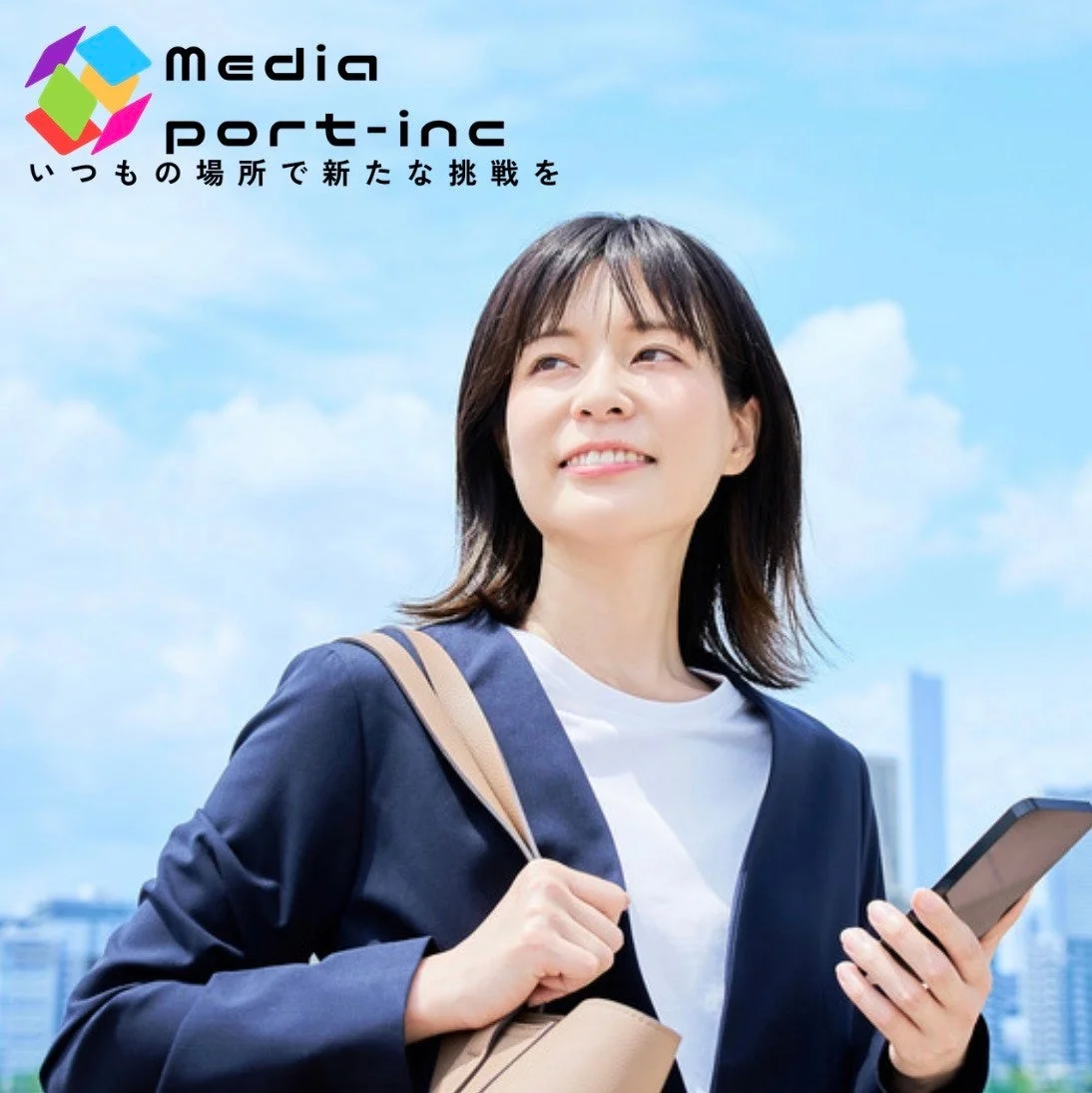 「media port-inc いつもの場所で新たな挑戦を」というスローガンと幾何学的なロゴ