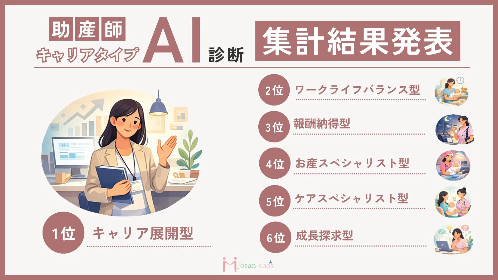3月5日は「産後ケアの日」、そして3月8日は「国際女性デー」でしたね。この時期に、助産師を中心とした産前産後ケアサービスを運営する株式会社Josan-she’s(ジョサンシーズ)が、助産師のキャリア志向を可視化するオンライン診断ツール「助産師キャリアタイプAI診断」の集計結果を発表しました!