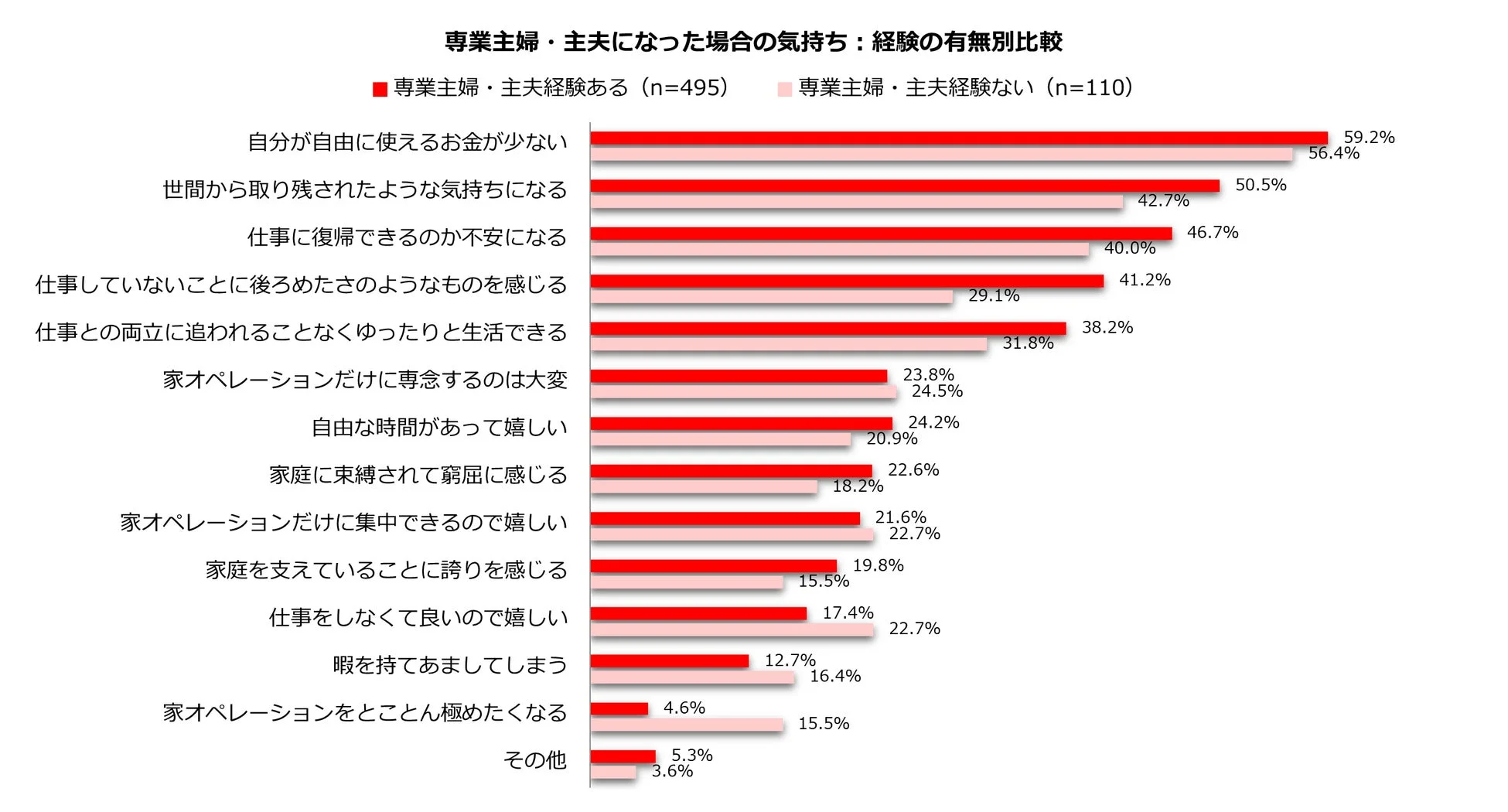 今回の調査では、専業主婦・主夫経験が「ある」人と「ない」人の間で、感じ方に大きな違いがあることが浮き彫りになりました。