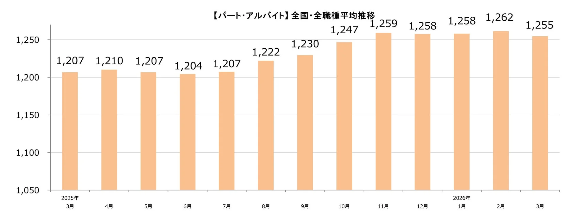 株式会社ビースタイル メディアが運営する求人サイト『しゅふJOB』の集計によると、2026年3月の全国・全職種平均時給は、パート・アルバイトで1,255円、派遣で1,488円となりました。