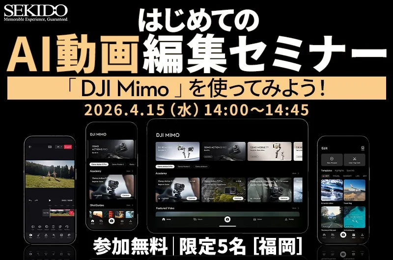 2026年4月15日(水)にDJI認定ストア福岡博多で開催される「はじめてのAI動画編集セミナー『DJI Mimo』を使ってみよう!」は、動画編集初心者さんでも大歓迎の体験型ミニ講座です。AIの力で、撮りためた動画がたった45分で魅力的なショート動画に生まれ変わる瞬間を、その場で体験できます。