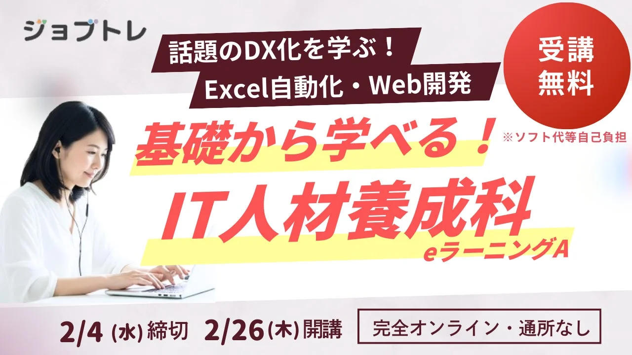 ワークキャリア株式会社は、このDX時代を乗りこなすための強力なサポートとなるeラーニング型の求職者支援訓練「基礎から学べる!IT人材養成科(eラーニングA)」の受講生を募集しています。2月26日(木)に開講するこのコースでは、プログラミングやWebアプリケーション開発の専門知識を体系的に学ぶことができます。